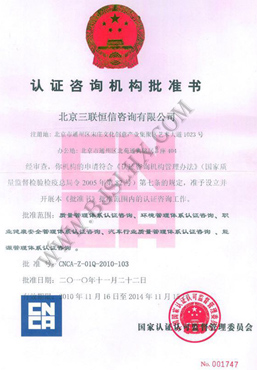 北京三聯恒信咨詢有限公司是在工商行政管理部門登記注冊,經國家認監委批準備案的ISO認證咨詢機構,批準范圍:質量管理體系認證咨詢、環境管理體系 認證咨詢、職業健康安全管理體系認證咨詢、汽車行業質量管理體系認證咨詢、能源管理體系認證咨詢等。批準號: